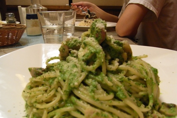 加了大量的羅勒,所以醬汁顏色是草綠色,平時喜歡清淡口味的人我會推薦吃青醬或清醬,青醬口味的義大利麵,吃起來清爽不膩,而且有股清香氣味,也不怕吃了會囤積過多油脂在身上,是蠻受歡迎的一道。