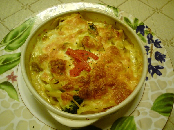 奶油為底作成的濃郁醬汁,我常拿烤得香酥的大蒜麵包沾著醬汁一起吃。煮醬汁時飄出的香味,就足以讓人流口水了 (ps:白醬中有一道阿菲度寬 麵,喜歡吃寬麵條的還有這項可選擇)
