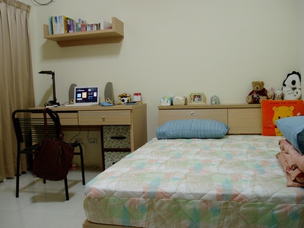 現在搬到的這邊是建設公司建造的,專門出租的,因此很多地方都考慮進去了。電梯可以給偷懶又高樓層的人使用,電視則是較少見的液晶電視,另外很棒的 地方是它有陽台,可以安心的曬衣服,不怕衣服被A走或有曬不乾的疑慮;而書桌正好在陽台旁,白天不用開室內燈或檯燈,陽光就足夠讀書了,還能享受早上的寧 靜跟涼風,書桌上方設有一個書架,可以放一整排的書或CD,算是解決了書籍不知往哪裡放的窘境。