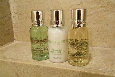 浴室是很乾淨和寬敞的,而且盥洗設備是使用英國品牌的"Molton Brown",很適合我這樣敏感肌膚的人。而且,這個品牌的盥洗設備幾乎只能在頂級的飯店才能看到! 雖然在台灣它不是非常知名的大品牌,因為它走低調風,所以不太看到它的廣告,不過在我心中,這絕對是貴婦等級的保養品阿!