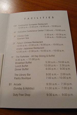 飯店提供一般的服務,如;乾洗衣物、清潔鞋子等,最貼心的服務是提供對應各個房間內的手機,若有事外出又怕連絡不上,可以把手機帶出去,打到房間的電話可以轉接到手機,可是用台灣帶去的手機撥打這支手機,還是得付漫遊的費用喔,但是這也為商務人士提供一個不漏接電話的好方法!