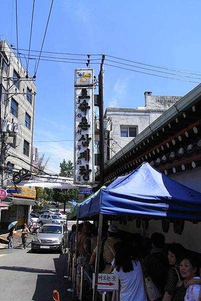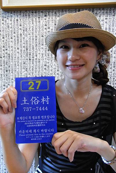 通常來這裡用餐的人真的很多,所以排隊是一定要的,而且我們中午12點到達的時候,已經有長長的排隊人龍,不過我也大致算了一下,即使在中午用餐時刻,排隊大約20分鐘就輪到了,翻桌率蠻高的! 而且在排隊的棚子旁放了不少支雨傘,因為在大太陽下,可以撐傘來避避暑。趁這個等待的時間,我跟妹妹一起在FB上打卡,這家是所有我們這次在韓國的餐廳中有打卡成功的!