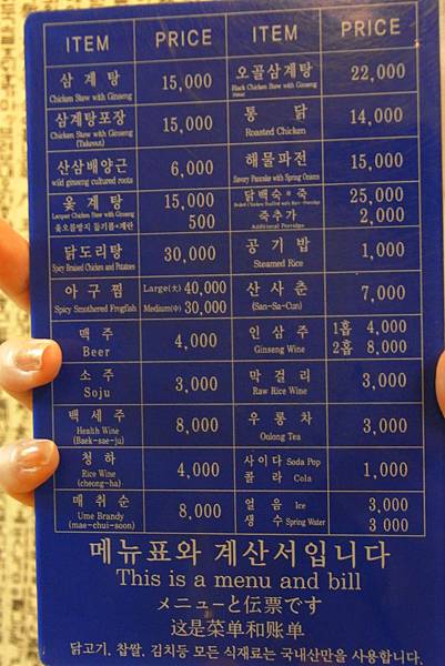 我看網友大多都是點最上方的那兩樣,左上是蔘雞湯₩15,000,右上為烏骨雞蔘雞湯₩22,000。價格跟我所做的功課比起來有些微上漲喔!