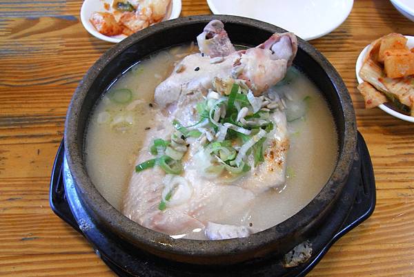 韓國的人蔘真的是挺有名的,所以來到韓國沒有吃一下人蔘雞那就太可惜了。引述一下網友精采的描述:『在韓國燉人蔘雞,要挑選七週大 (49 天) 的嫩雞來燉雞湯,因為韓國人認為這個天數的雞肉最嫩,搭配人蔘一起燉煮是最佳的組合。送上來的人蔘雞湯,一整鍋湯呈現白色色澤,湯頭之濃郁不在話下。韓國人蔘雞的煮法,是將人參、栗子、紅棗、大蒜、和糯米等,放入已去除內臟的童子雞內,燉煮上數小時,至雞肉嫩滑入味,所有的菁華都封存在雞肚內。』