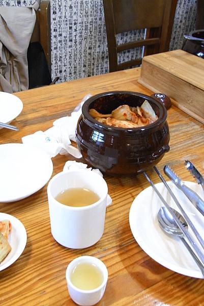 然後旁邊是韓國餐廳必備的泡菜! 可以單吃,也可以加一些到雞湯中。喔! 順道說明旁邊那小小杯的東西,那是人蔘酒,可以先喝一口看看,再把酒倒入雞湯,不過酒挺辣的,如果不勝酒力或是不慣喝酒的人,其實也可以不用把酒全加到蔘雞湯。 → 我自己只喝了一小口嘗鮮!